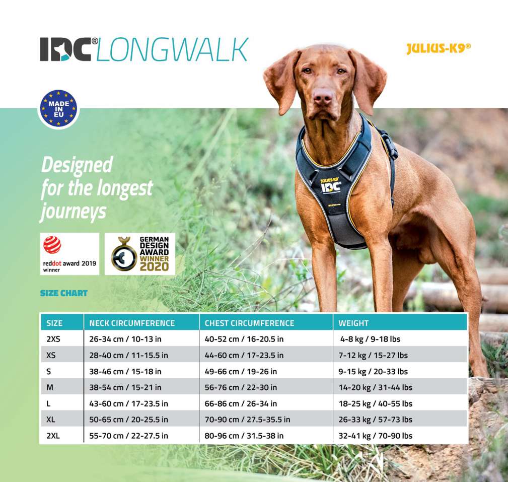 IDC® Longwalk oprsnica posebno je dizajnirana za duge šetnje, tako da kada odete iz grada niste vi jedini koji će obući prikladnu i kvalitetnu opremu. IDC® Longwalk dizajniran je da se aktivno prilagođava vašim pokretima. Tri elastično pričvršćena prstena reagiraju na pokrete psa i vlasnika, tako da Duo-Flex® osigurava da je oprsnica uvijek udobna čak i tijekom najdužih šetnji.