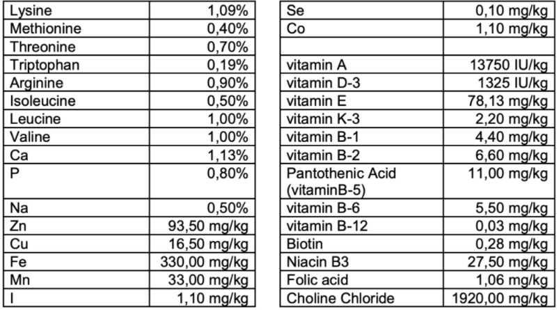 Sirovi Protein 22,00 % Ulja i masti 12,00 % Sirovi Pepeo 8,00 % Sirova Vlakna 8,00 % Vlaga 10,00 %